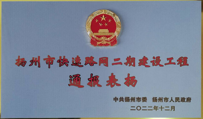 我公司承建的揚州江平東路快速化改造工程質量、安全、進度、精細化管理等各項指標在揚州市快速路網二期工程同期各標段中均名列前茅,受到中共揚州市委、揚州市人民政府通報表揚。